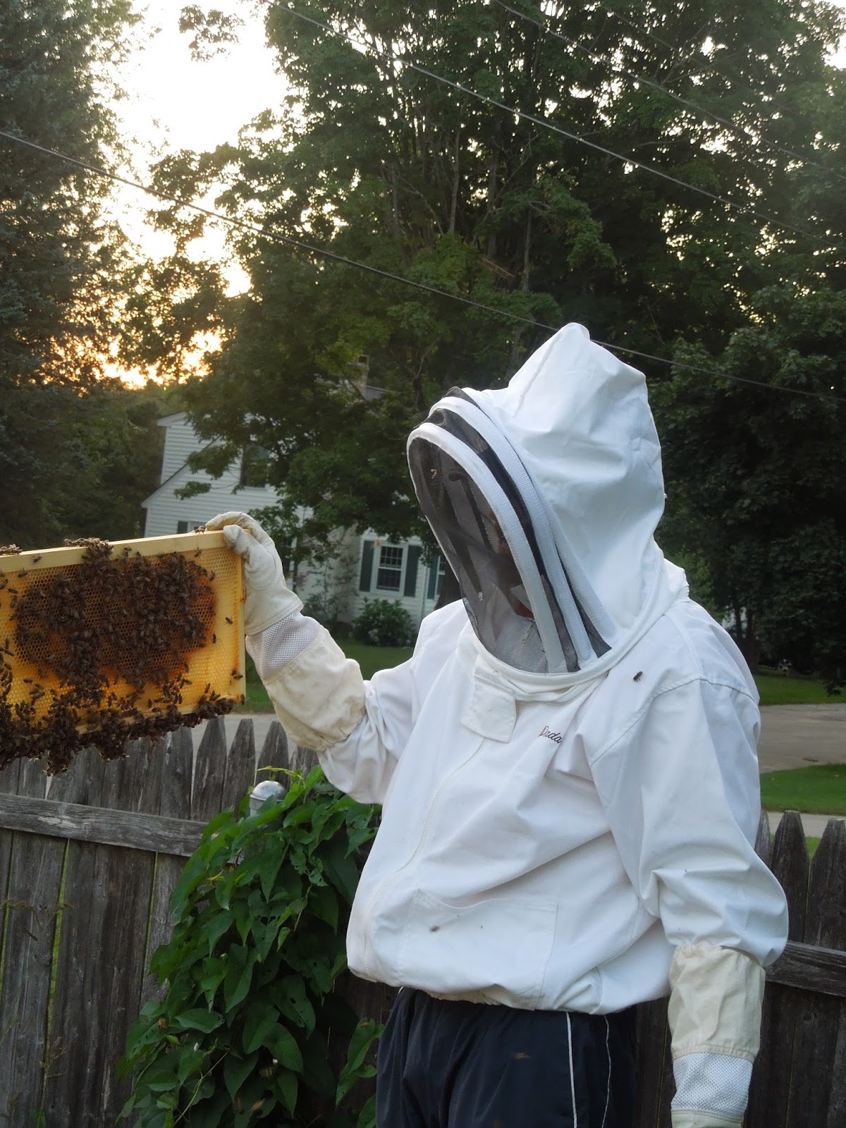 Searching the original hive, Dan found the second box (which name I can't figure out...honey? brood? It's really quite confusing. As long as he's got it figured out....) to be very heavy! Full of honey! Between both hives, they had been eating about 20 pounds of sugar water every couple of days!